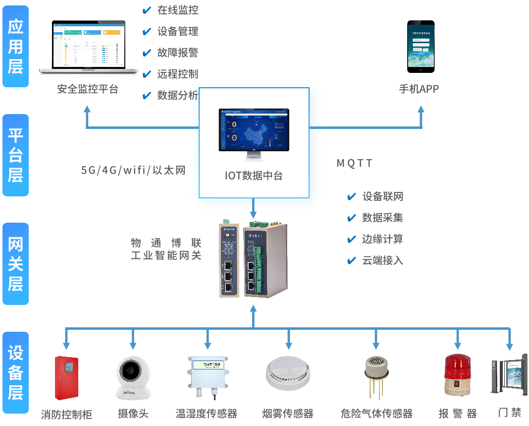 為加強燃氣廠站安全監(jiān)測水平,防范事故隱患,物通博聯(lián)提供基于工業(yè)智能網(wǎng)關(guān)的遠程監(jiān)測安全預(yù)警系統(tǒng),通過將工業(yè)智能網(wǎng)關(guān)接入到燃氣廠站內(nèi)各個流量計、壓力計、可燃氣體濃度傳感器、消防控制柜、攝像頭等設(shè)備,網(wǎng)關(guān)可以實時采集數(shù)據(jù)并對數(shù)據(jù)進行標(biāo)準化處理,實現(xiàn)以5G/4G/WIFI/以太網(wǎng)等方式上傳到安全監(jiān)控云平臺,實現(xiàn)設(shè)備遠程監(jiān)控、遠程控制、遠程維護及數(shù)據(jù)分析等功能。