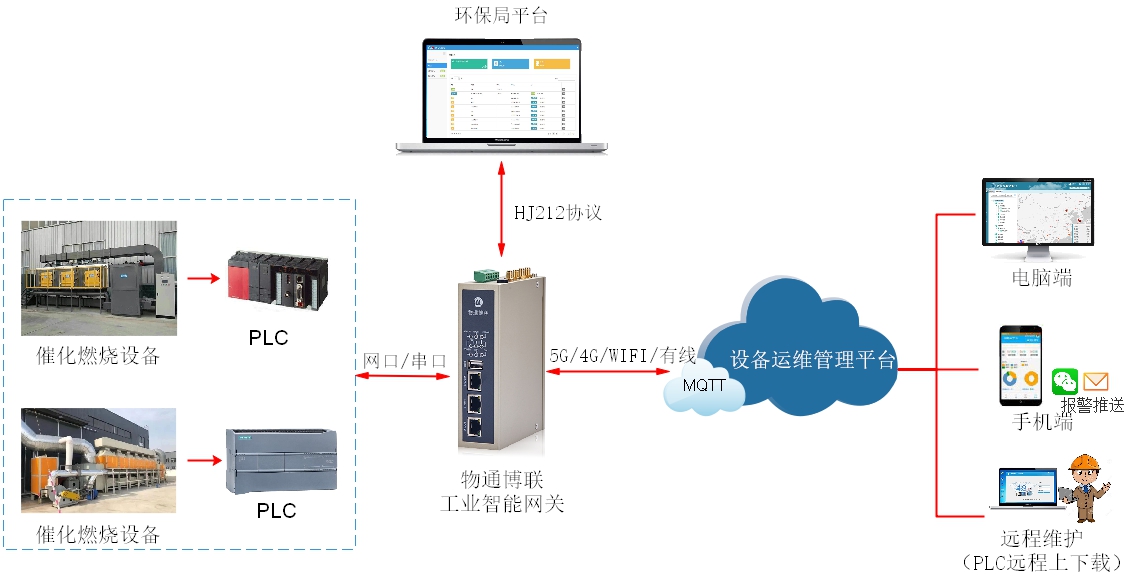 針對上述行業(yè)痛點(diǎn),物通博聯(lián)提供催化燃燒設(shè)備數(shù)據(jù)采集遠(yuǎn)程監(jiān)控系統(tǒng),實(shí)現(xiàn)設(shè)備的實(shí)時(shí)監(jiān)控與智能管理。通過將物通博聯(lián)工業(yè)智能網(wǎng)關(guān)接入催化燃燒設(shè)備控制柜PLC,實(shí)時(shí)采集設(shè)備數(shù)據(jù)并以5G/4G/WIFI/以太網(wǎng)等方式上傳到上位機(jī)或云平臺(tái)中,實(shí)現(xiàn)設(shè)備狀態(tài)和參數(shù)的實(shí)時(shí)監(jiān)控、異常告警、遠(yuǎn)程控制、數(shù)據(jù)分析等功能,為工廠廢氣治理提供可靠幫助。
