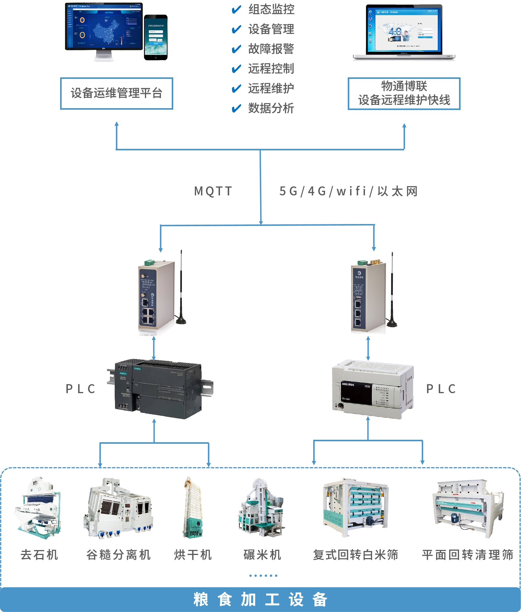 物通博聯(lián)提供基于工業(yè)智能網(wǎng)關(guān)的糧食加工設(shè)備遠(yuǎn)程監(jiān)控智慧運(yùn)維系統(tǒng)解決方案。通過將去石機(jī)、碾米機(jī)、拋光機(jī)、烘干機(jī)的控制器PLC接入到物通博聯(lián)工業(yè)智能網(wǎng)關(guān),網(wǎng)關(guān)就能采集設(shè)備數(shù)據(jù)并通過5G/4G網(wǎng)絡(luò)上傳到設(shè)備運(yùn)維管理平臺(tái)中,從而實(shí)現(xiàn)對(duì)設(shè)備位置分布、數(shù)量類型、運(yùn)行狀態(tài)、告警事件、運(yùn)維工單等監(jiān)控和管理,從而綜合運(yùn)用大數(shù)據(jù)分析技術(shù),驅(qū)動(dòng)企業(yè)運(yùn)營決策與服務(wù)升級(jí),有效加強(qiáng)售后市場(chǎng)建設(shè),增強(qiáng)市場(chǎng)競(jìng)爭(zhēng)力。