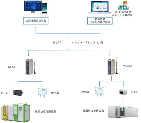 物通博聯(lián)工業(yè)智能網(wǎng)關(guān)WG583與餐廚垃圾處理設(shè)備進(jìn)行通訊,可以將設(shè)備的運(yùn)行狀態(tài)、工作參數(shù)等數(shù)據(jù)采集到網(wǎng)關(guān)上,進(jìn)行解析并上報(bào)到云端。