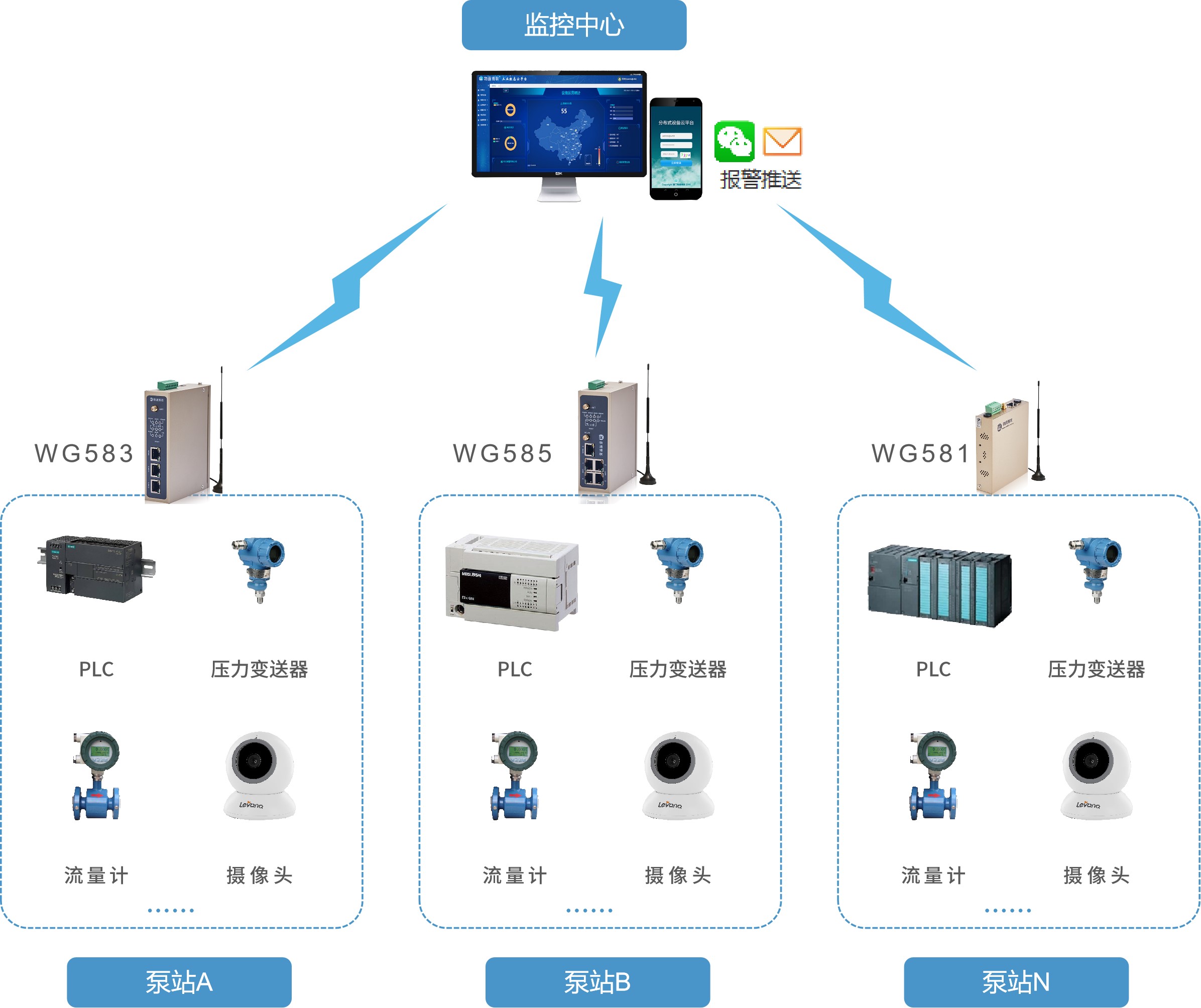 通過接入水泵控制柜PLC、壓力計、流量計、攝像頭等設(shè)備,物通博聯(lián)水利監(jiān)測網(wǎng)關(guān)能夠?qū)崟r采集水泵閥門的運行狀態(tài)與工藝參數(shù)、管網(wǎng)水壓及流量、現(xiàn)場視頻等數(shù)據(jù),并通過5G/4G無線網(wǎng)絡(luò)上傳到泵站監(jiān)控管理平臺中,從而實現(xiàn)遠程監(jiān)控、自動告警、遠程控制、運維管理、遠程維護多種功能,從而為泵站巡檢運維與數(shù)據(jù)分析等工作提供全面可靠的數(shù)據(jù)支持,助力做出科學(xué)合理決策,有效加強泵站管理水平,保障取水安全。
